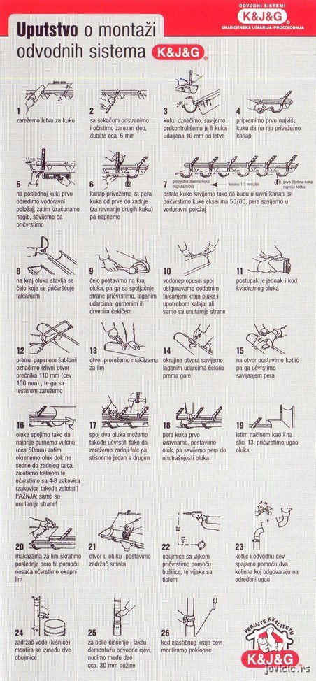 K&J&G je brzorastuća slovačka firma koja posluje već više od 15 godina i ima otvorena predstavništva u više zemalja srednje i jugoistočne Evrope. Firma insistira na kvalitetu proizvoda ( poznato? ), posluje na modernim principima, ima ultramodernu opremu, mašine poslednje generacije i zatvoreni proizvodni prostor u Čahticama od preko 33000 m2 . Proizvodni program građevinske limarije čini preko 1000 proizvoda (oko 150 modela kuka!) usklađenih sa evropskim standardima kvaliteta i više hiljada pratećih artikala. Dosta ulažu u proširenje proizvodnih kapaciteta i širenje asortimana proizvoda. U sezoni dnevno u firmu uđe/izađe oko 450 tona materijala! Lim od koga se prave oluci, cevi i prateći elementi je najvišeg kvaliteta, proizvodnje USS Steel Košice, debljine 0.55 mm, kvaliteta DX 52 (za savijanje opšivki) i DX 53 (proizvodni za oluke i cevi), sa nanosom cinka od 275 g/m2 ( ! ), obojen poliUretanskim prahom (skuplji, ali zato mnogo trajniji premaz od kod nas uobičajenog poliEsterskog), sa zaštitnom folijom (sprečava nehotično grebanje lima tokom rada).