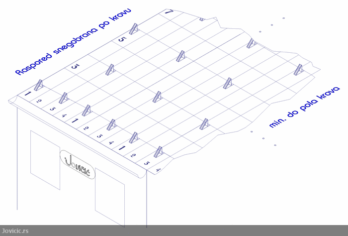 Unašim (ekonomskim) uslovima se postavlja neki minimalan broj Preporuka je da se po ovom rasporedu 'dođe' bar do pola krova, kao i da se u donjem redu postavi duplo više snegobrana (na svaku drugu crepljiku). Broj komada zavisi od nagiba krova i od dužine rogova. Za strmije krovove većih dužina treba postaviti i više redova snegobrana. Postavljanje je lako i brzo. Najlakše ih je postaviti u toku postavke crepa (ili tegole). Bez problema se postavljaju i na već postavljenu pokrivku. Na mestu gde treba staviti snegobran treba malo podići gornju crepljiku, zavući vrh snegobrana na kome je kuka (raznih je oblika, prilagođenih konkretnom crepu) i zakačiti ga za crep. Snegobrani se rade potpuno mašinski (presovanjem). Profil snegobrana je ojačan dubokim rebrima. Kritična mesta na snegobranu (duža strana trougla i vrh sa kukom za kačenje) su dodatno ojačani (grifovani). Spajanje (pri formiranju trougla) se vrši mehanički (pertlovanjem), što osigurava najbolji spoj za razne materijale. Proizvodi se od pocinkovanog i bakarnog lima debljine 1mm. Pocinkovani snegobrani se naknadno plastificiraju u odgovarajuće boje.